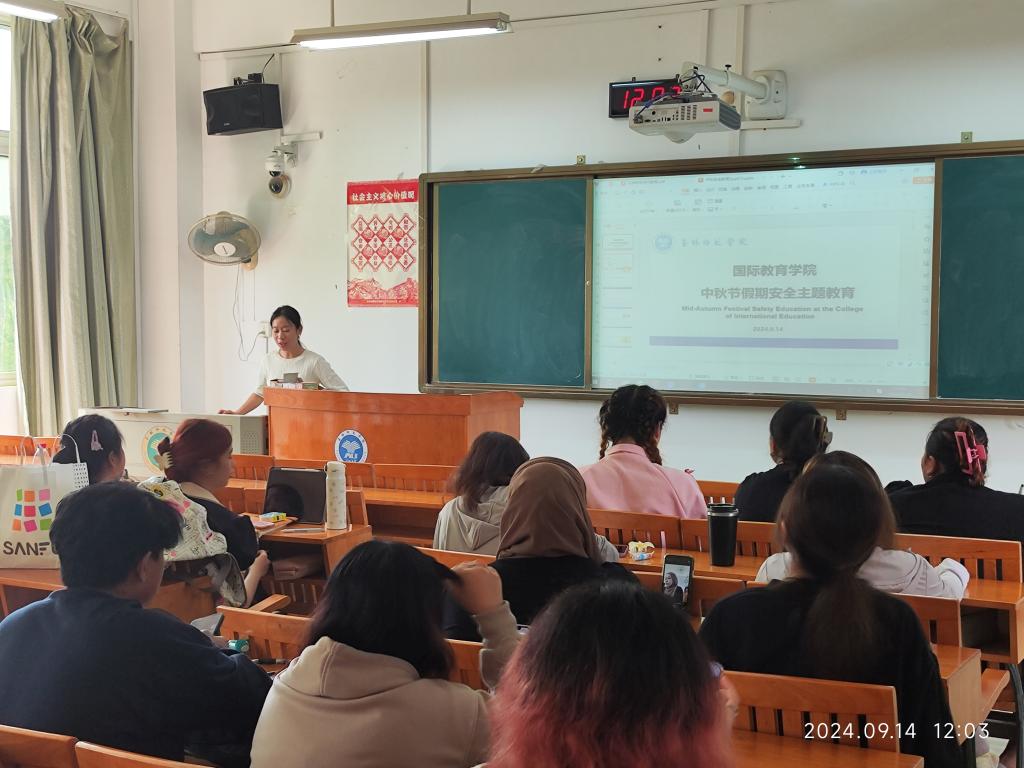 9月14日上午,国际教育学院在文科楼204教室召开2024年秋季学期中秋节、国庆节假期安全教育主题班会,本次会议由辅导员梁艺馨主持,国际教育学院全体留学生参加会议。