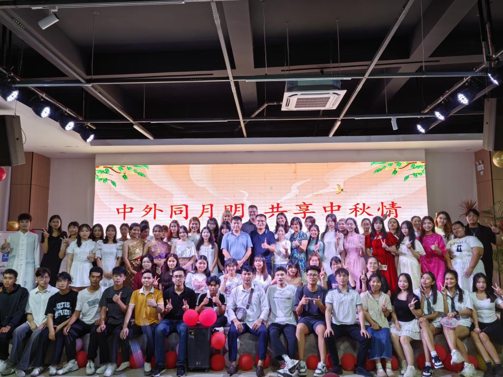 最后,中外师生一起分享月饼并合影留念,一块块月饼蕴含着学校领导老师对学生的问候和祝福,也承载着中国传统文化的独特魅力。留学生们对学校领导老师的关心和祝福表示感谢,同时表达了对中国传统文化的赞美与喜爱。