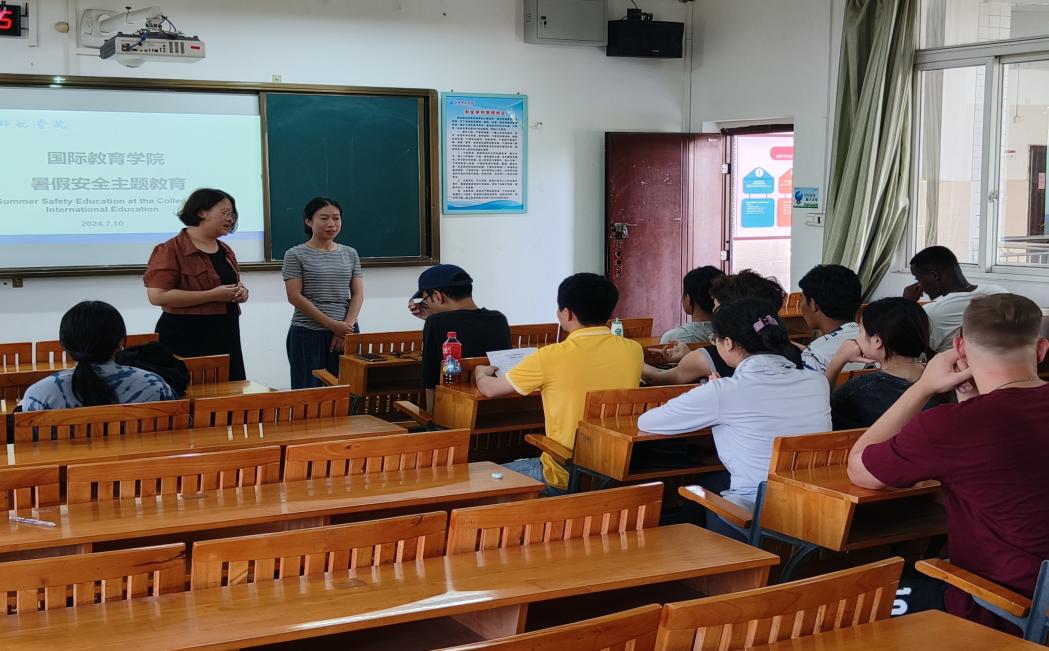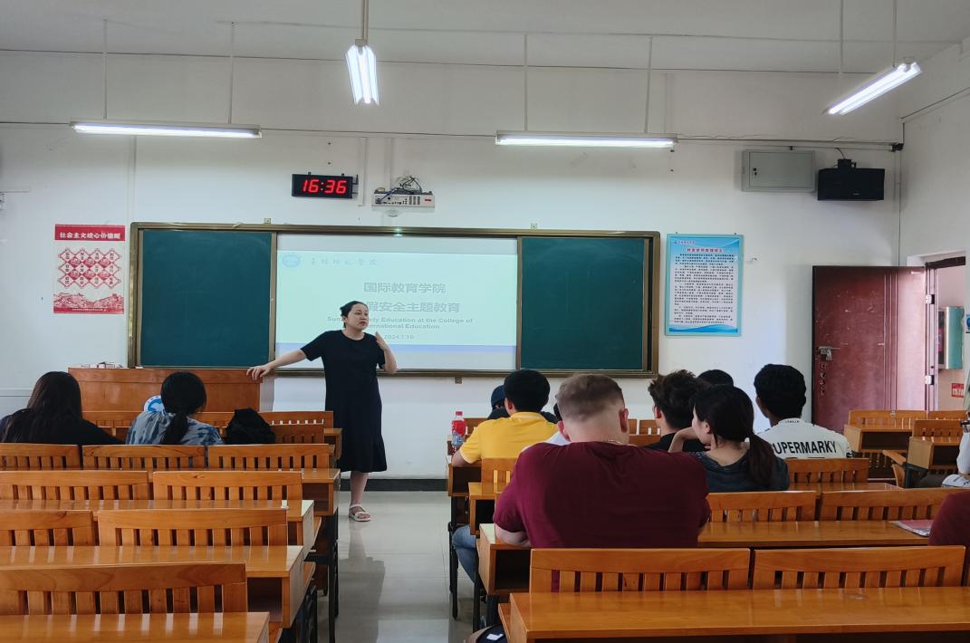 为保障留学生暑期安全,7月10日下午,国际教育学院在文科楼204教室召开暑期安全教育会议,国际教育学院副院长韦媛媛、留学生招生与管理科科长韦玫、辅导员梁艺馨以及在校全体留学生学历生和语言生参加会议。